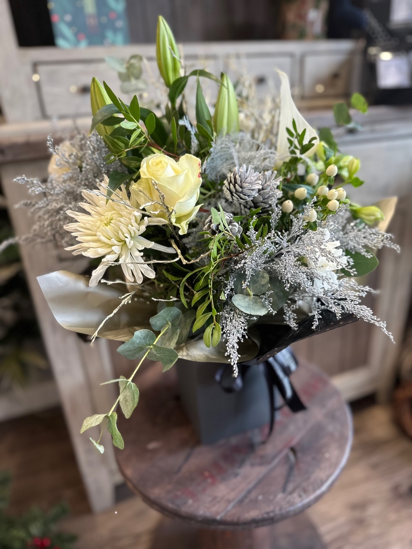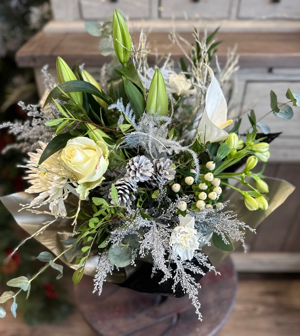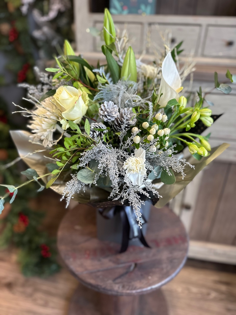 Discover 'Mistletoe,' our exquisite box arrangement full of the crisp whites of winter and the festive greens of the season! Finished off with charming Christmas pinecones for that festive flourish!