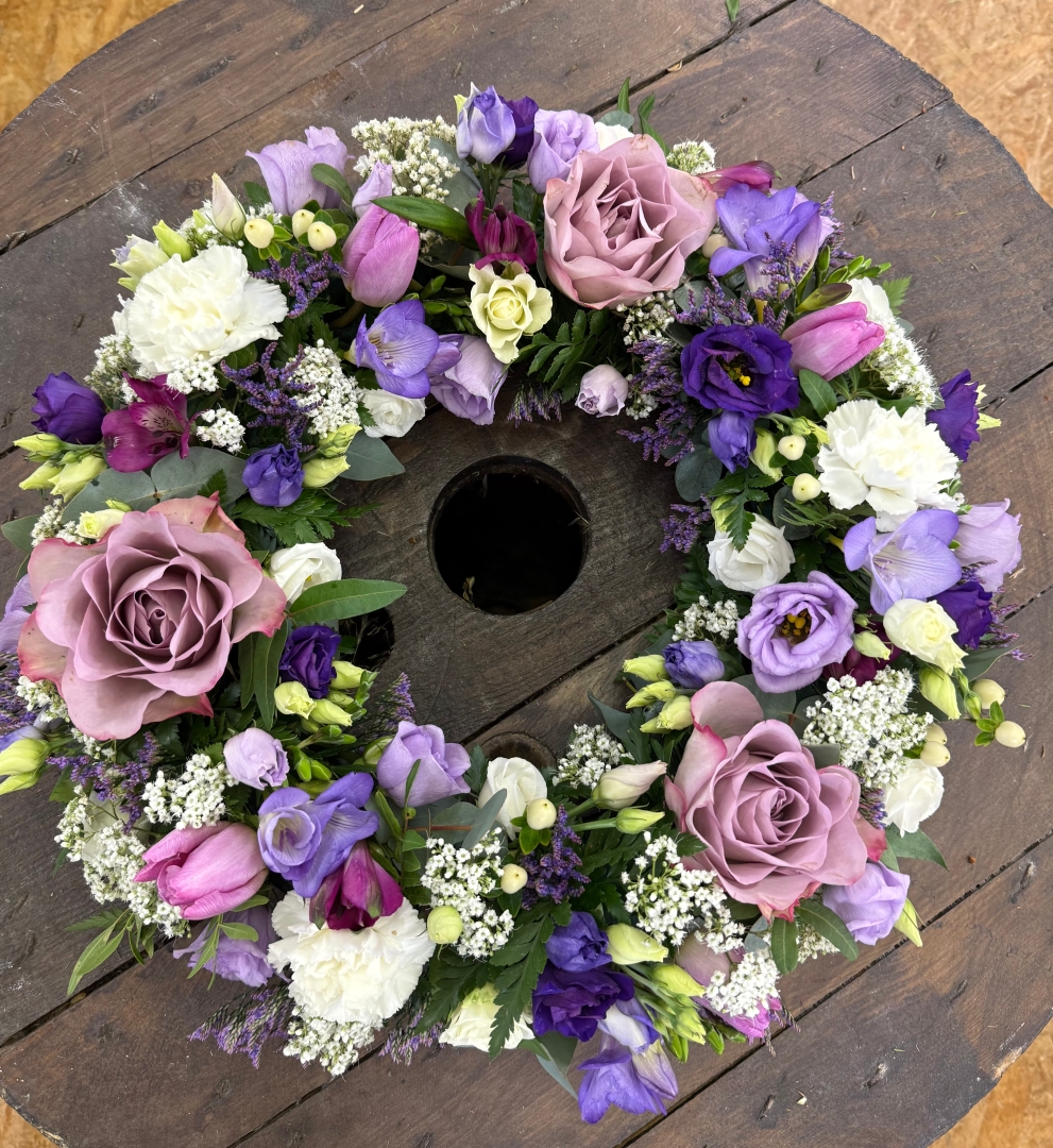 A beautiful textured classic style wreath tribute, Arranged in a wet floral foam base using a lovely selection of seasonal flowers. Different colour options are available during the ordering process.