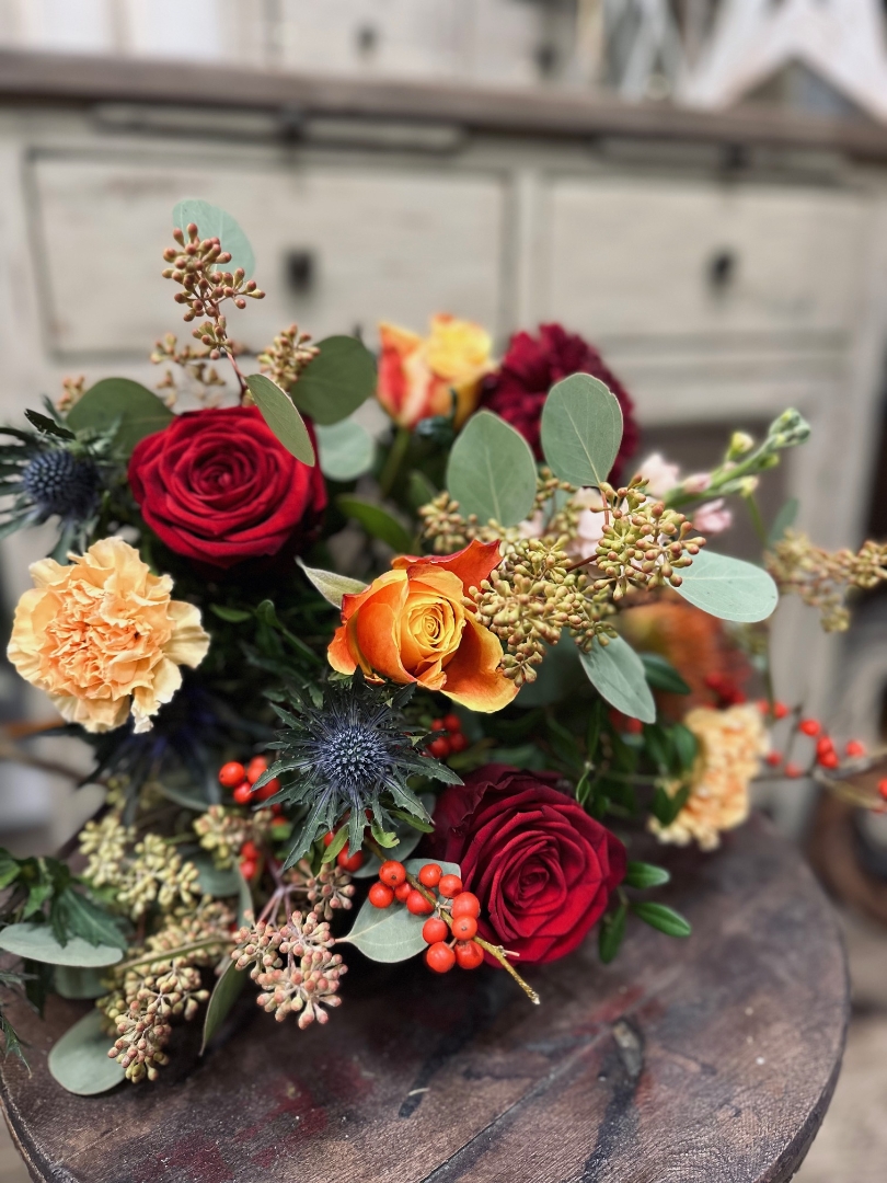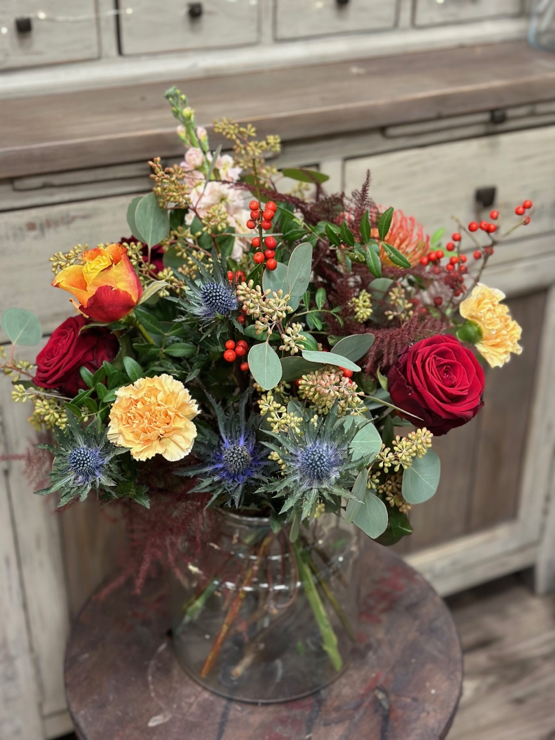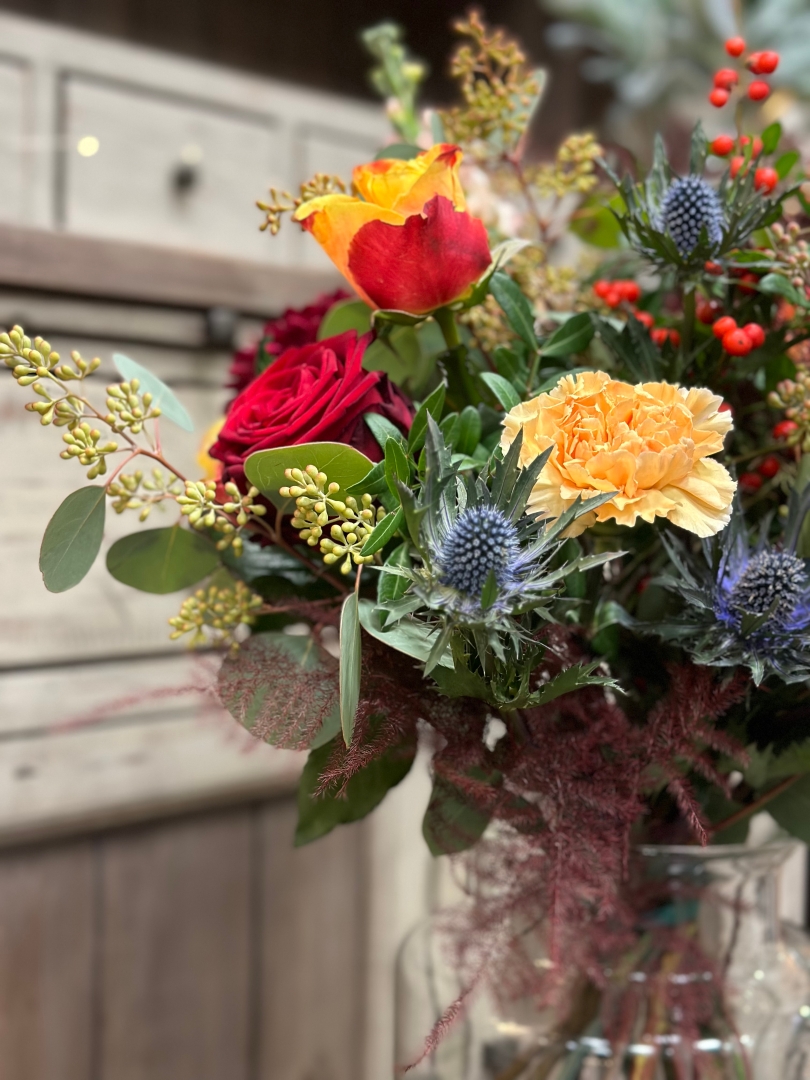 This stylish festive bouquet features peach tones, a hint of orange, deep reds, bursts of winter blue, and beautiful Christmas foliage. Each bouquet is hand-arranged and lovingly wrapped in luxurious paper and finished off with trendy bow.